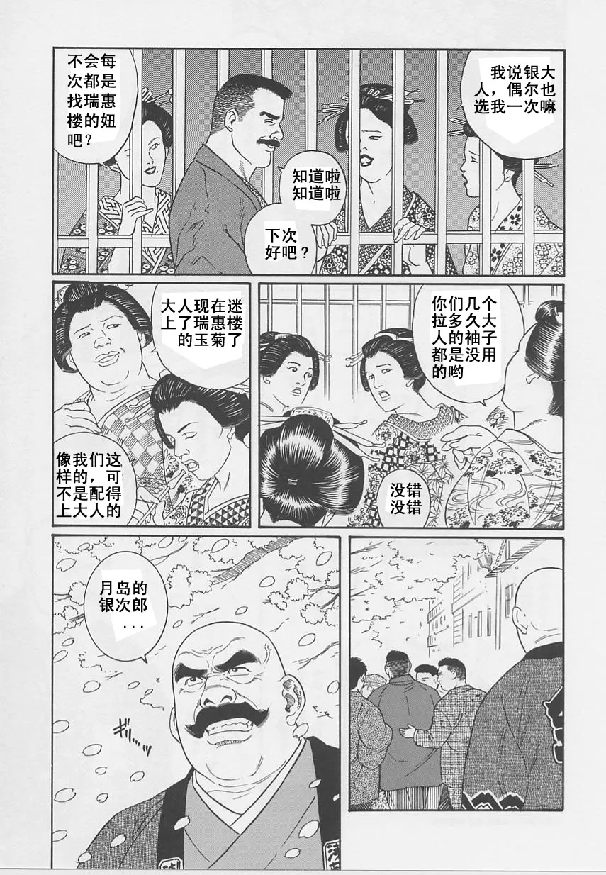 《银の华》除了细腻的堕落书写以外,亦有对于配角的出彩塑造,比如金华楼的佣人常,虽然是施虐的帮凶,但是会对暴力有所迟疑,也会展现出一些人情味。他和另一位佣人的感情亦是一条副线,因为另一位佣人需要他所以他在最后无法收留银次郎,只能望着银次郎离去而落泪,他对银次郎的喜欢里或许包含着同情。而男主角银次郎的心上人玉菊也有着不错的描写,因为银次郎能够真正的体会“在苦海中翻腾的女人的苦楚”而彻底喜欢上银次郎,最后以砍下未婚夫的头作为反抗,迎来了毁灭的结局,在男同志向成人漫画中,亦有着对女性苦难的描写,或许这也是田龟源五郎的一个优点。